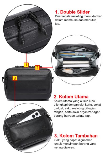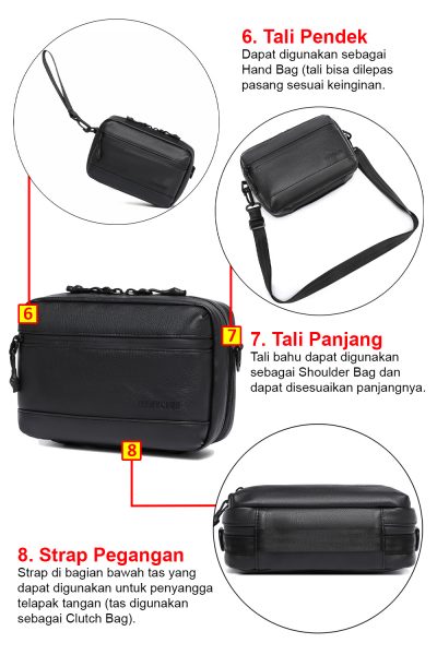Bagian depan tas terdapat satu kolom tambahan untuk menyimpan barang yang sering diakses dan dibagian bawah tas dilengkapi strap / handle bar, tali sling pendek dan panjang sehingga dapat digunakan untuk berbagai mode (Clutch Bag, Hand Bag, Sling Bag).
