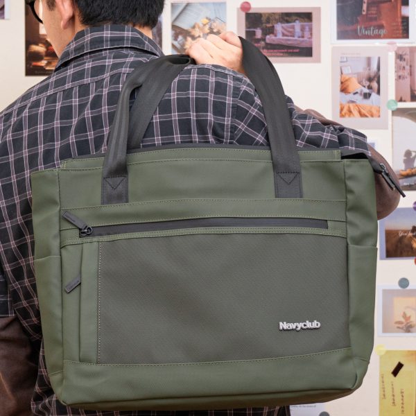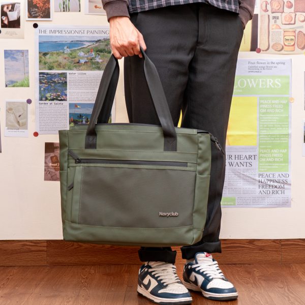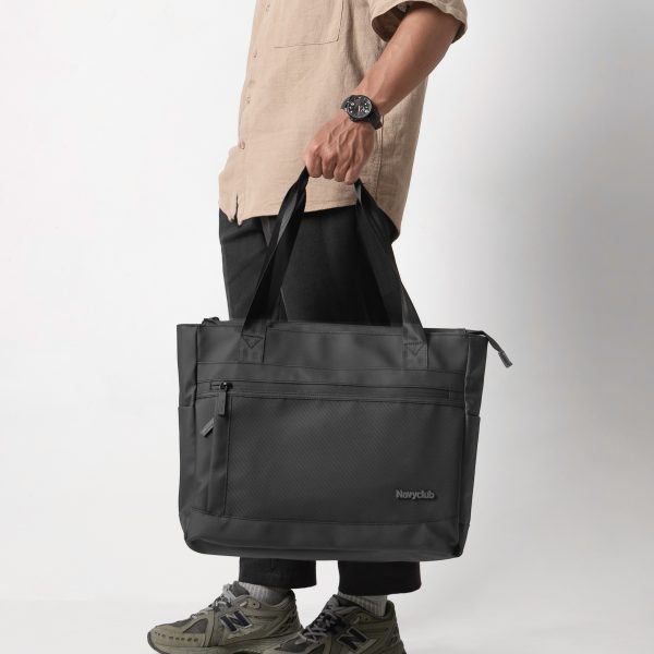 Navy Club Fadana totebag travel bag atau tas pakaian terbuat dari bahan fabric oxford, dengan bahan water repellent yang dapat memberi perlindungan sementara dari cipratan air dan hujan dengan intensitas ringan. Tali jinjing dijahit menyatu dengan badan tas sehingga lebih kuat untuk menahan beban tas. Kolom utama yang luas bisa untuk membawa banyak barang bawaan dilengkapi dengan sekat khusus laptop max. 14 inch, saku organizer untuk menyimpan barang essensial, dan kantong untuk tempat botol air minum dibagian dalam tas.
