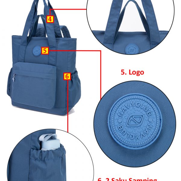 Navy Club Regate two way totebag terbuat dari bahan nilon berkualitas tinggi, Daily casual laptop tas multifungsi yg dapat digunakan sebagai ransel, totebag ataupun tas jinjing. Sempurna untuk digunakan sebagai tas sehari-hari kamu. Dengan bahan water repellent yang dapat memberi perlindungan sementara dari cipratan air dan hujan dengan intensitas ringan. Kolom utama yang luas bisa untuk membawa banyak barang bawaan dilengkapi dengan laptop sleeve max. 14 inch dengan bantalan dan penutup dengan velcro. Terdapat pula saku resleting dibagian dalam tasnya, saku organizer untuk menyimpan barang essensial, dan kantong untuk tempat botol air minum dibagian dalam tas.