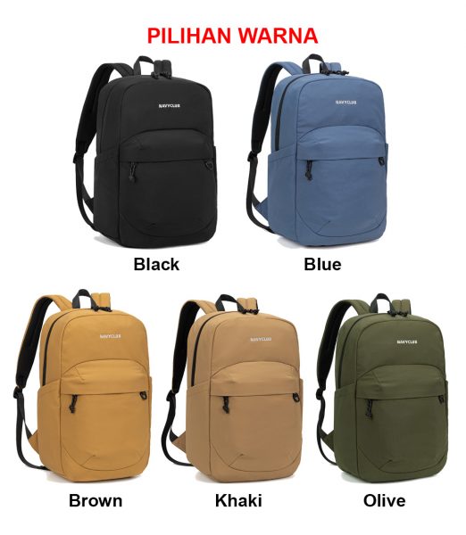 Navy Club tas ransel laptop berbahan polyester, cocok digunakan untuk sehari-hari seperti sekolah, kuliah dan kerja. Dengan pilihan warna yang menarik membuat penampilan Anda semakin stylish. Kolom utama yang luas dilengkapi dengan sekat untuk laptop max. 14 inch dan saku organizer untuk menyimpan barang essensial. Tersedia kolom tambahan dibagian depan tas untuk menyimpan barang yang sering diakses.