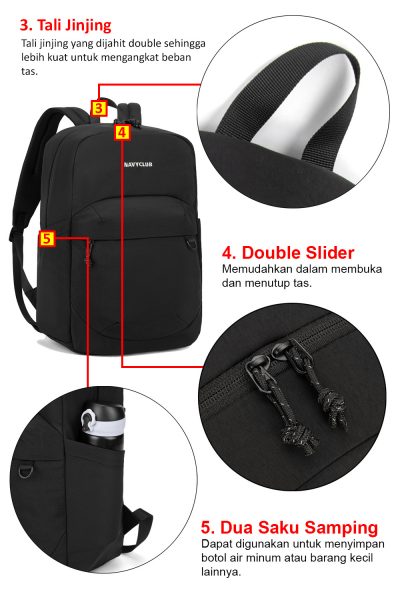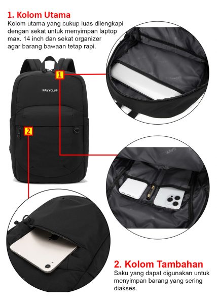 Navy Club tas ransel laptop berbahan polyester, cocok digunakan untuk sehari-hari seperti sekolah, kuliah dan kerja. Dengan pilihan warna yang menarik membuat penampilan Anda semakin stylish. Kolom utama yang luas dilengkapi dengan sekat untuk laptop max. 14 inch dan saku organizer untuk menyimpan barang essensial. Tersedia kolom tambahan dibagian depan tas untuk menyimpan barang yang sering diakses.