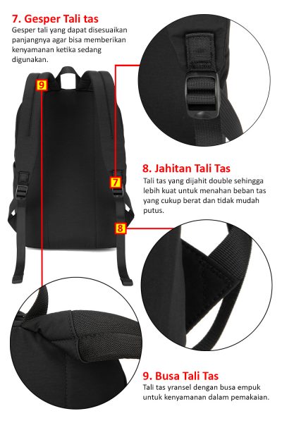 • Tali ransel dengan busa empuk untuk kenyamanan dalam pemakaian